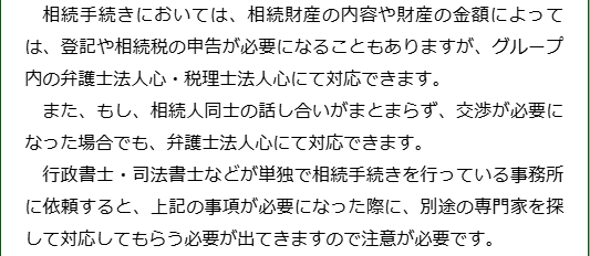 グループ法人に弁護士法人や税理士法人がありますので、遺産の分け方をめぐって争いが生じている場合や税金の申告が必要な場合なども対応が可能で、幅広くサポートさせていただくことが可能です。