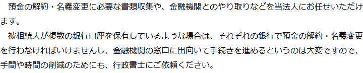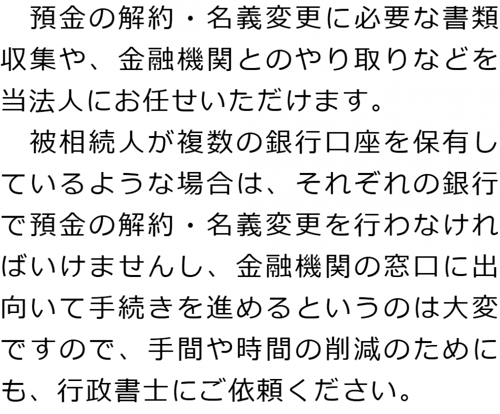 トップ業務内容預金・貯金の解約・名義変更 階層構造▼ 業務内容(目次) 預金・貯金の解約・名義変更 業務内容(目次)業務内容トップ行政書士法人心の業務内容遺言遺産整理相続人調査相続財産調査遺産分割協議書の作成預金・貯金の解約・名義変更証券口座の解約・名義変更自動車の名義変更心グループのその他の業務内容家族信託・民事信託節税対策事業承継遺言の検認相続放棄限定承認遺産分割遺留分侵害額請求相続登記相続税申告相続税調査 受付時間 平日 9時~21時、土日祝 9時~18時 夜間・土日祝の相談も対応します (要予約) 所在地 〒103-0028 東京都中央区八重洲1-5-9八重洲加藤ビルデイング6F (旧表記:八重洲アメレックスビル6F) 0120-2403-39 お問合せ・アクセス・地図