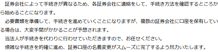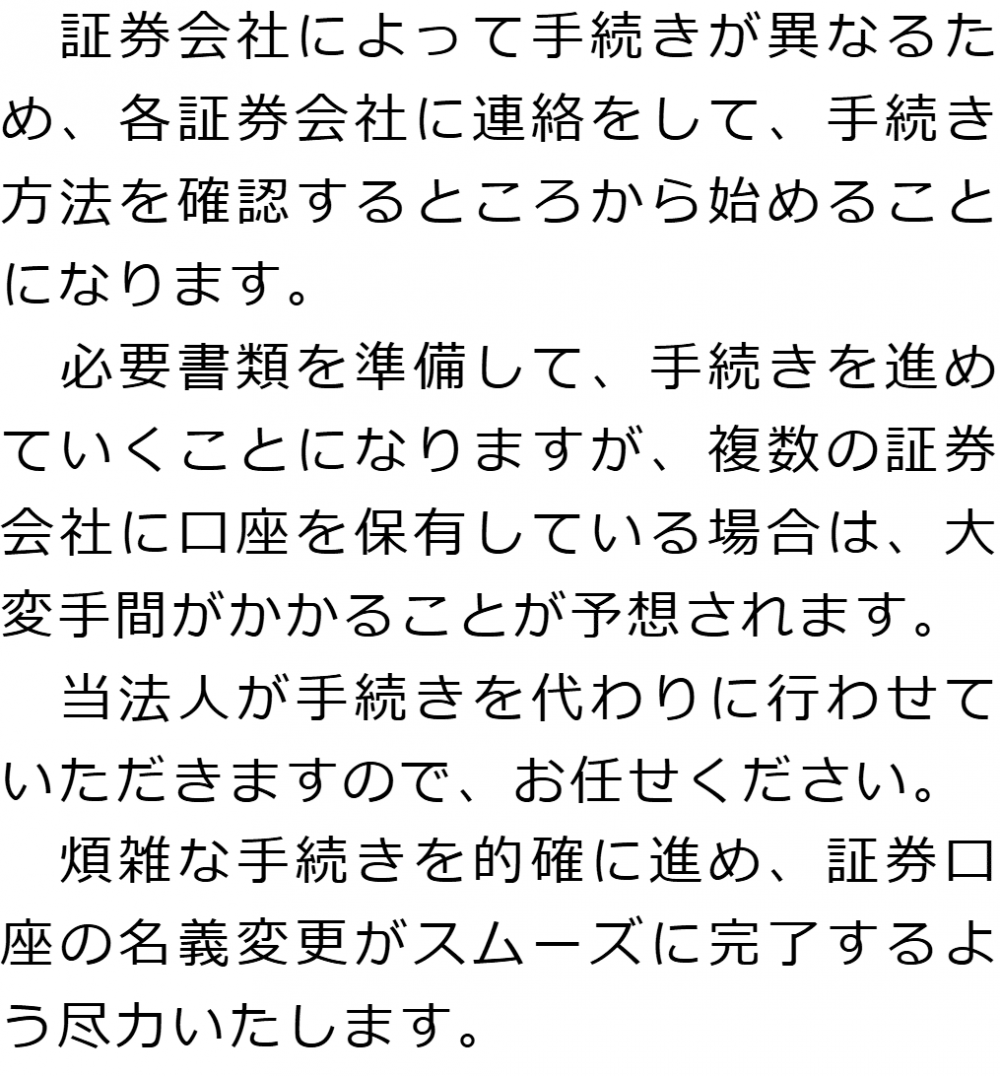 トップ業務内容証券口座の解約・名義変更 階層構造▼ 業務内容(目次) 証券口座の解約・名義変更 業務内容(目次)業務内容トップ行政書士法人心の業務内容遺言遺産整理相続人調査相続財産調査遺産分割協議書の作成預金・貯金の解約・名義変更証券口座の解約・名義変更自動車の名義変更心グループのその他の業務内容家族信託・民事信託節税対策事業承継遺言の検認相続放棄限定承認遺産分割遺留分侵害額請求相続登記相続税申告相続税調査 受付時間 平日 9時~21時、土日祝 9時~18時 夜間・土日祝の相談も対応します (要予約) 所在地 〒103-0028 東京都中央区八重洲1-5-9八重洲加藤ビルデイング6F (旧表記:八重洲アメレックスビル6F) 0120-2403-39 お問合せ・アクセス・地図