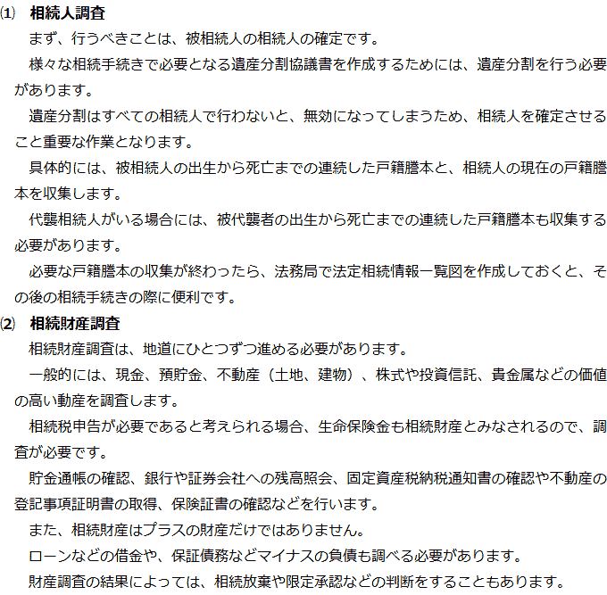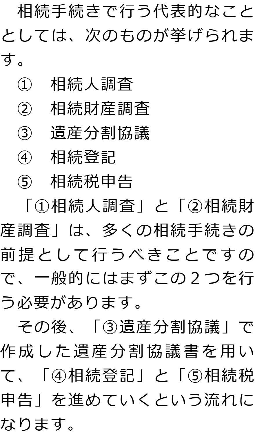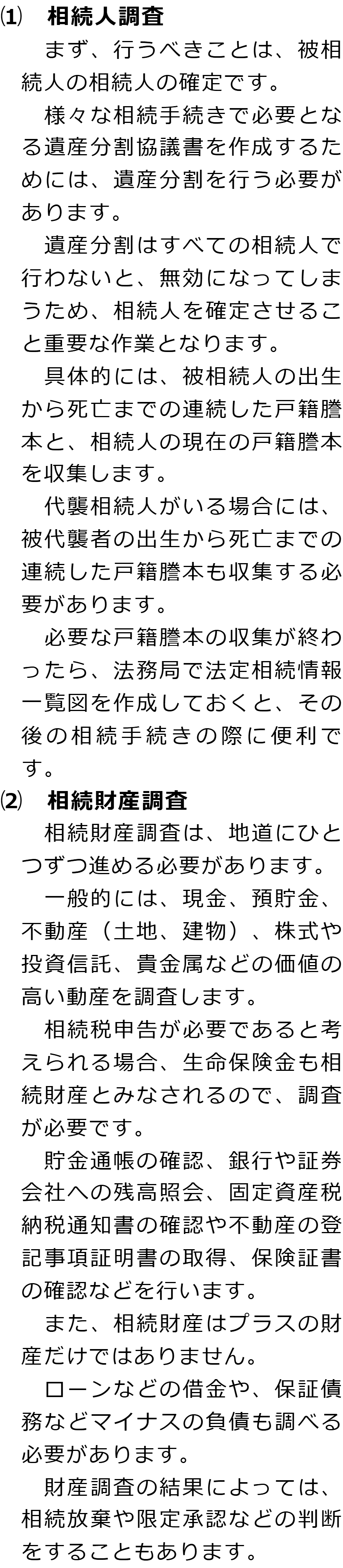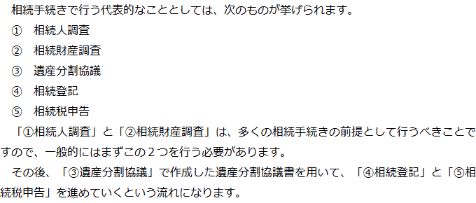 相続手続きの必要事項に関するQ&AQ相続手続きでは何をする必要がありますか?Q相続人調査と相続財産調査では何をする必要がありますか?Q遺産分割では何が必要ですか?Q相続登記はどのような場合に必要ですか?Q相続税申告はどのような場合に必要ですか? Q相続手続きでは何をする必要がありますか?AQ相続人調査と相続財産調査では何をする必要がありますか?AQ遺産分割では何が必要ですか?AQ相続登記はどのような場合に必要ですか?AQ相続税申告はどのような場合に必要ですか?A Q&A(目次)Q&Aトップ相続手続きの必要事項に関するQ&A 受付時間 平日 9時~21時、土日祝 9時~18時 夜間・土日祝の相談も対応します (要予約) 所在地 〒103-0028 東京都中央区八重洲1-5-9八重洲加藤ビルデイング6F (旧表記:八重洲アメレックスビル6F) 0120-2403-39 お問合せ・アクセス・地図