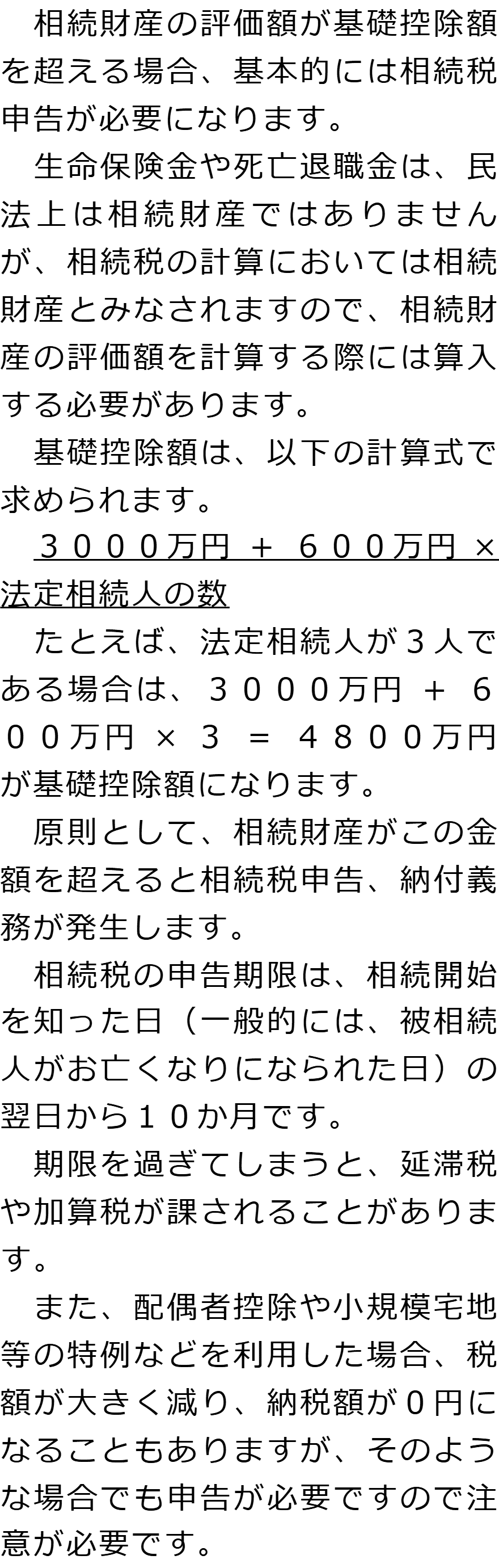 Q相続税申告はどのような場合に必要ですか?A Q&A(目次)Q&Aトップ相続手続きの必要事項に関するQ&A 受付時間 平日 9時~21時、土日祝 9時~18時 夜間・土日祝の相談も対応します (要予約) 所在地 〒103-0028 東京都中央区八重洲1-5-9八重洲加藤ビルデイング6F (旧表記:八重洲アメレックスビル6F) 0120-2403-39 お問合せ・アクセス・地図