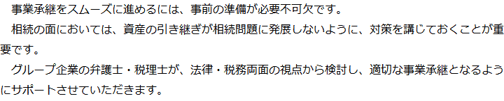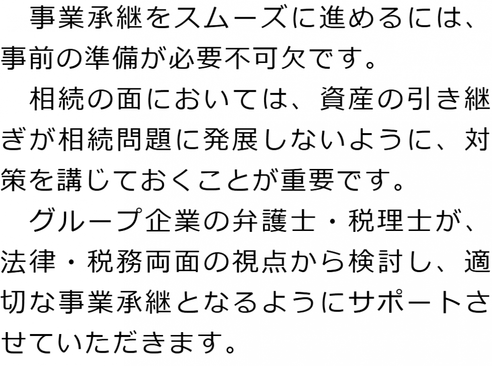 トップ業務内容事業承継 階層構造▼ 業務内容(目次) 事業承継 業務内容(目次)業務内容トップ行政書士法人心の業務内容遺言遺産整理相続人調査相続財産調査遺産分割協議書の作成預金・貯金の解約・名義変更証券口座の解約・名義変更自動車の名義変更心グループのその他の業務内容家族信託・民事信託節税対策事業承継遺言の検認相続放棄限定承認遺産分割遺留分侵害額請求相続登記相続税申告相続税調査 受付時間 平日 9時~21時、土日祝 9時~18時 夜間・土日祝の相談も対応します (要予約) 所在地 〒103-0028 東京都中央区八重洲1-5-9八重洲加藤ビルデイング6F (旧表記:八重洲アメレックスビル6F) 0120-2403-39 お問合せ・アクセス・地図