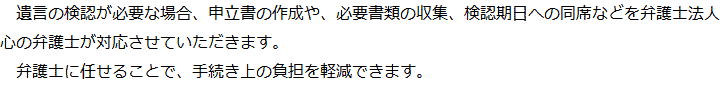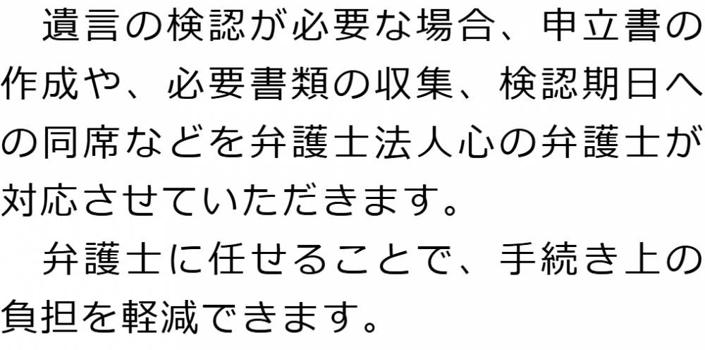 トップ業務内容遺言の検認 階層構造▼ 業務内容(目次) 遺言の検認 業務内容(目次)業務内容トップ行政書士法人心の業務内容遺言遺産整理相続人調査相続財産調査遺産分割協議書の作成預金・貯金の解約・名義変更証券口座の解約・名義変更自動車の名義変更心グループのその他の業務内容家族信託・民事信託節税対策事業承継遺言の検認相続放棄限定承認遺産分割遺留分侵害額請求相続登記相続税申告相続税調査 受付時間 平日 9時~21時、土日祝 9時~18時 夜間・土日祝の相談も対応します (要予約) 所在地 〒103-0028 東京都中央区八重洲1-5-9八重洲加藤ビルデイング6F (旧表記:八重洲アメレックスビル6F) 0120-2403-39 お問合せ・アクセス・地図