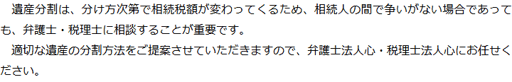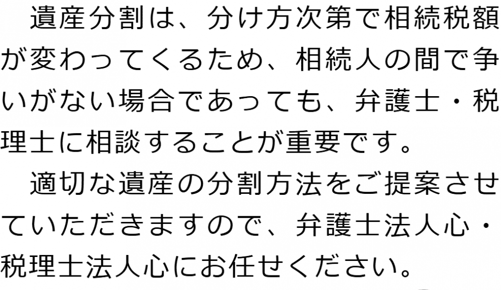 トップ業務内容遺産分割 階層構造▼ 業務内容(目次) 遺産分割 業務内容(目次)業務内容トップ行政書士法人心の業務内容遺言遺産整理相続人調査相続財産調査遺産分割協議書の作成預金・貯金の解約・名義変更証券口座の解約・名義変更自動車の名義変更心グループのその他の業務内容家族信託・民事信託節税対策事業承継遺言の検認相続放棄限定承認遺産分割遺留分侵害額請求相続登記相続税申告相続税調査 受付時間 平日 9時~21時、土日祝 9時~18時 夜間・土日祝の相談も対応します (要予約) 所在地 〒103-0028 東京都中央区八重洲1-5-9八重洲加藤ビルデイング6F (旧表記:八重洲アメレックスビル6F) 0120-2403-39 お問合せ・アクセス・地図