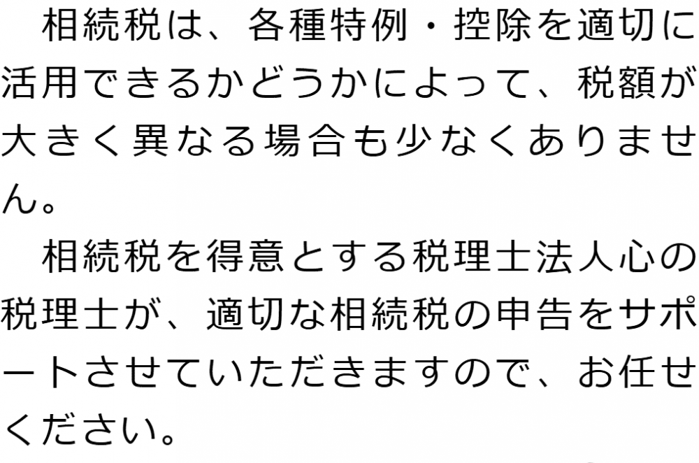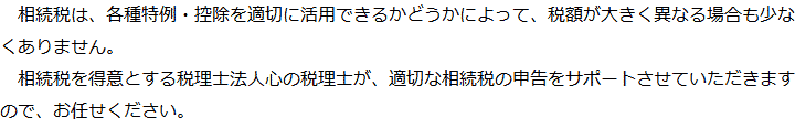 トップ業務内容相続税申告 階層構造▼ 業務内容(目次) 相続税申告 業務内容(目次)業務内容トップ行政書士法人心の業務内容遺言遺産整理相続人調査相続財産調査遺産分割協議書の作成預金・貯金の解約・名義変更証券口座の解約・名義変更自動車の名義変更心グループのその他の業務内容家族信託・民事信託節税対策事業承継遺言の検認相続放棄限定承認遺産分割遺留分侵害額請求相続登記相続税申告相続税調査 受付時間 平日 9時~21時、土日祝 9時~18時 夜間・土日祝の相談も対応します (要予約) 所在地 〒103-0028 東京都中央区八重洲1-5-9八重洲加藤ビルデイング6F (旧表記:八重洲アメレックスビル6F) 0120-2403-39 お問合せ・アクセス・地図