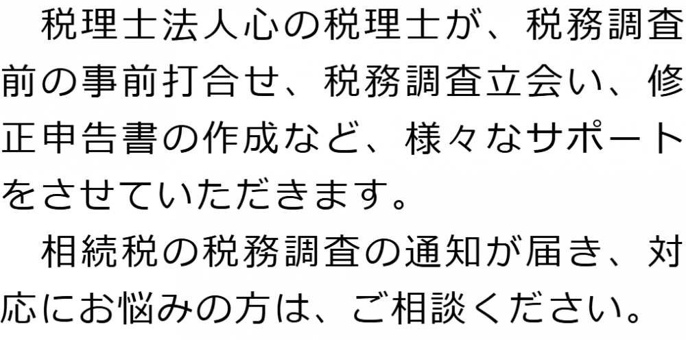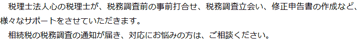 トップ業務内容相続税調査 階層構造▼ 業務内容(目次) 相続税調査 業務内容(目次)業務内容トップ行政書士法人心の業務内容遺言遺産整理相続人調査相続財産調査遺産分割協議書の作成預金・貯金の解約・名義変更証券口座の解約・名義変更自動車の名義変更心グループのその他の業務内容家族信託・民事信託節税対策事業承継遺言の検認相続放棄限定承認遺産分割遺留分侵害額請求相続登記相続税申告相続税調査 受付時間 平日 9時~21時、土日祝 9時~18時 夜間・土日祝の相談も対応します (要予約) 所在地 〒103-0028 東京都中央区八重洲1-5-9八重洲加藤ビルデイング6F (旧表記:八重洲アメレックスビル6F) 0120-2403-39 お問合せ・アクセス・地図